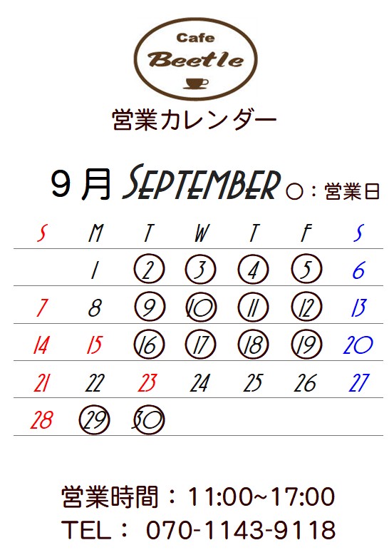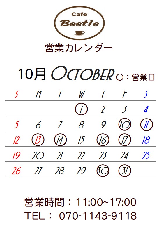 ![]() カフェ・ビートル 営業時間 11:00~17:00 2025年10月の営業カレンダーをアップしました。 宜しくお願いします。 ![]() 〒989-5301 宮城県栗原市栗駒岩ヶ崎神南23-7 電話: 070-1143-9118 (営業の有無、予約、テイクアウトの相談等は電話にてお問い合わせください) |