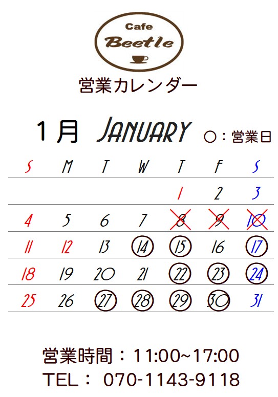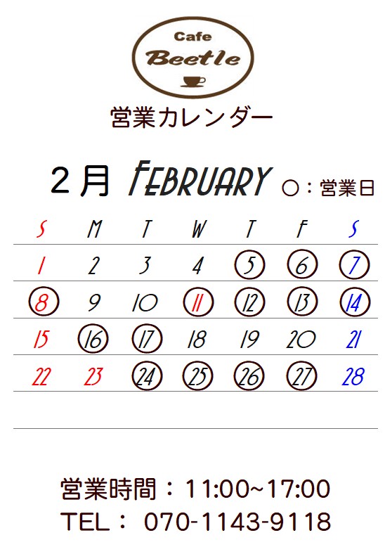 カフェ・ビートル 営業時間 11:00~17:00 2026年2月の営業カレンダーをアップしました。 宜しくお願いします。 ![]() 〒989-5301 宮城県栗原市栗駒岩ヶ崎神南23-7 電話: 070-1143-9118 (営業の有無、予約、テイクアウトの相談等は電話にてお問い合わせください) |